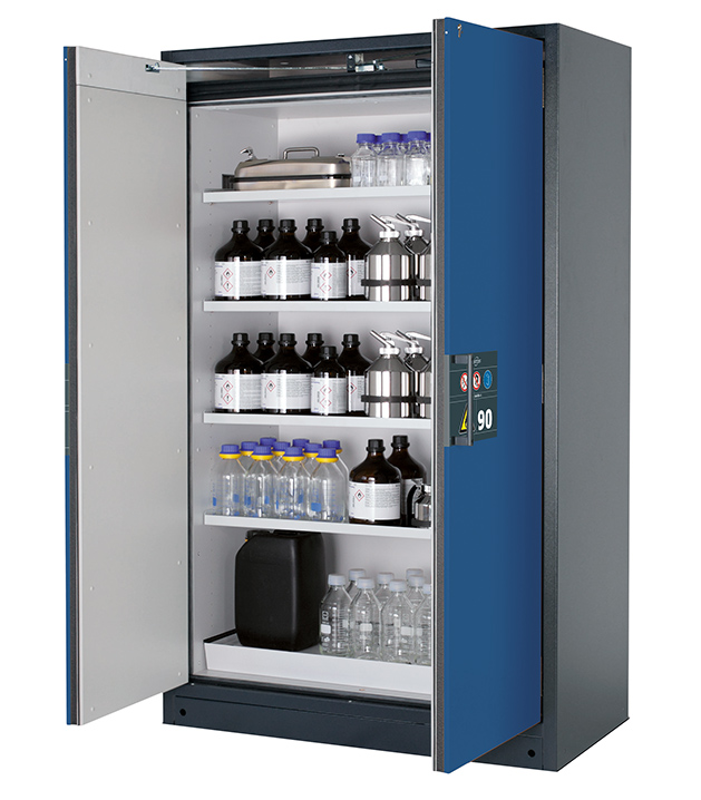 Korpusfarbe Anthrazitgrau (RAL 7016), mit Flügeltüren in Enzianblau (RAL 5010), Inneneinrichtung mit 4 x Fachboden, 1 x Lochblecheinsatz, 1 x Bodenauffangwanne (Stahlblech pulverbeschichtet)