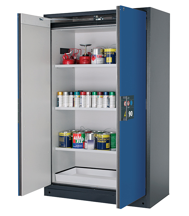 Korpusfarbe Anthrazitgrau (RAL 7016), mit Flügeltüren in Enzianblau (RAL 5010), Inneneinrichtung mit 3 x Fachboden, 1 x Bodenauffangwanne (Stahlblech pulverbeschichtet)