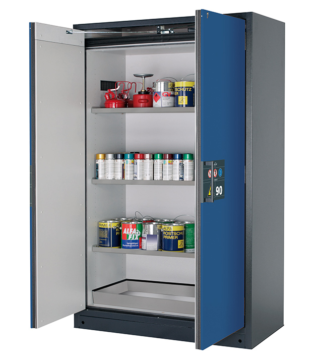 Korpusfarbe Anthrazitgrau (RAL 7016), mit Flügeltüren in Enzianblau (RAL 5010), Inneneinrichtung mit 3 x Fachboden (Edelstahl 1.4301), 1 x Bodenauffangwanne (Edelstahl 1.4016)