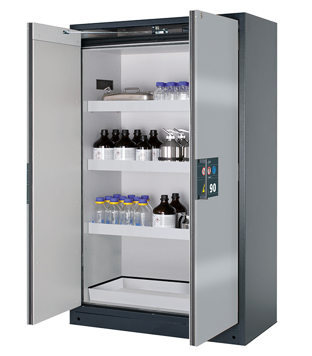 Korpusfarbe Anthrazitgrau (RAL 7016), mit Flügeltüren in asecos Silber, Inneneinrichtung mit 3 x Wannenboden, 1 x Bodenauffangwanne (Stahlblech pulverbeschichtet)