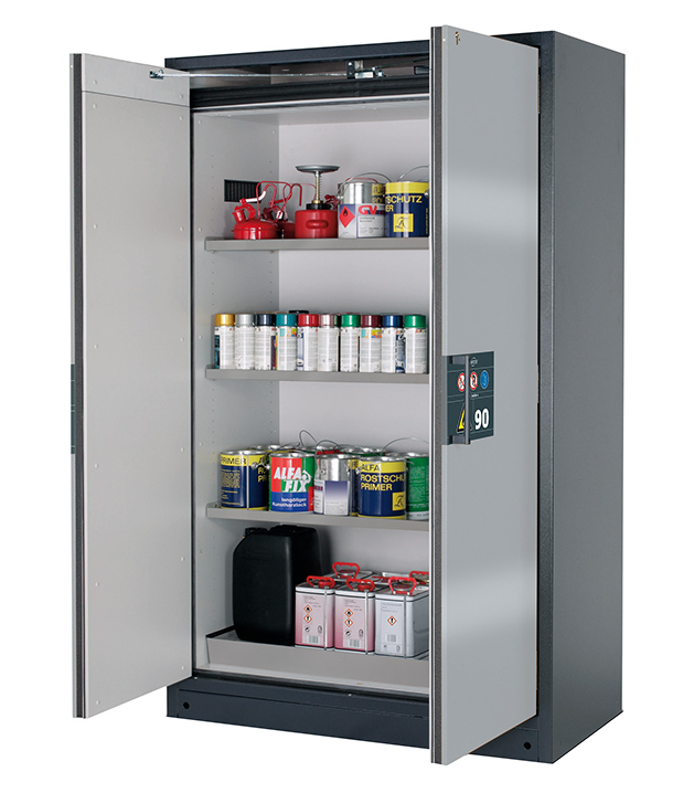 Korpusfarbe Anthrazitgrau (RAL 7016), mit Flügeltüren in asecos Silber, Inneneinrichtung mit 3 x Fachboden (Edelstahl 1.4301), 1 x Lochblecheinsatz, 1 x Bodenauffangwanne (Edelstahl 1.4016)