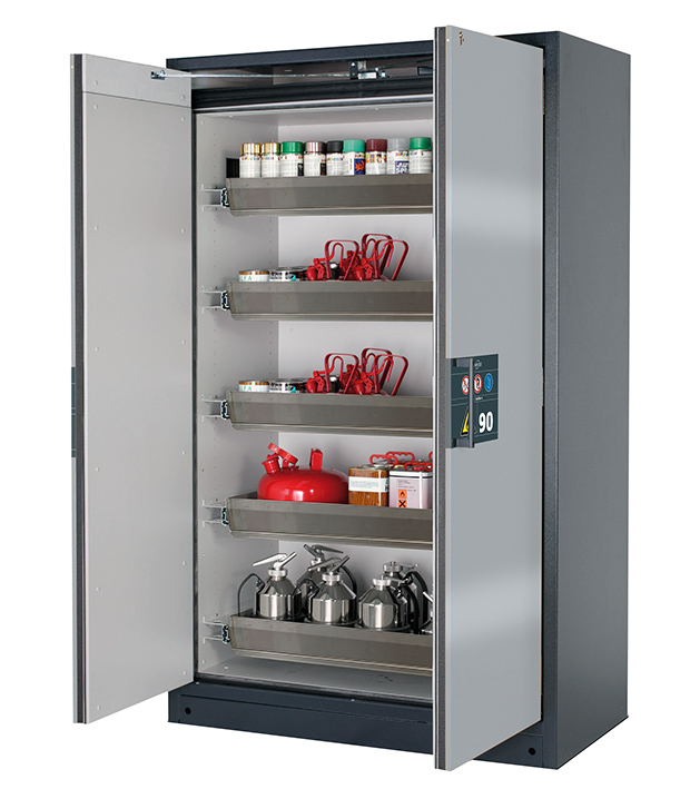 Korpusfarbe Anthrazitgrau (RAL 7016), mit Flügeltüren in asecos Silber, Inneneinrichtung mit 5 x Auszugswanne (Edelstahl 1.4301)