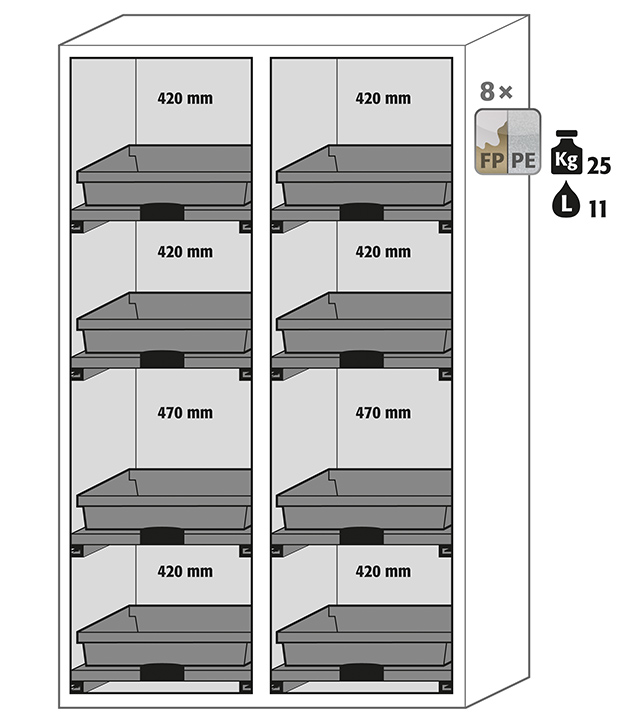 Lichtgrau (RAL 7035), Inneneinrichtung mit 8 x Tablarauszug (Werkstoffplatte/PP melaminharzbeschichtet)