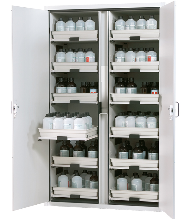 - Zwei in einem: zwei Abteile erlauben die getrennte Lagerung von Säuren und Laugen in einem Schrank
