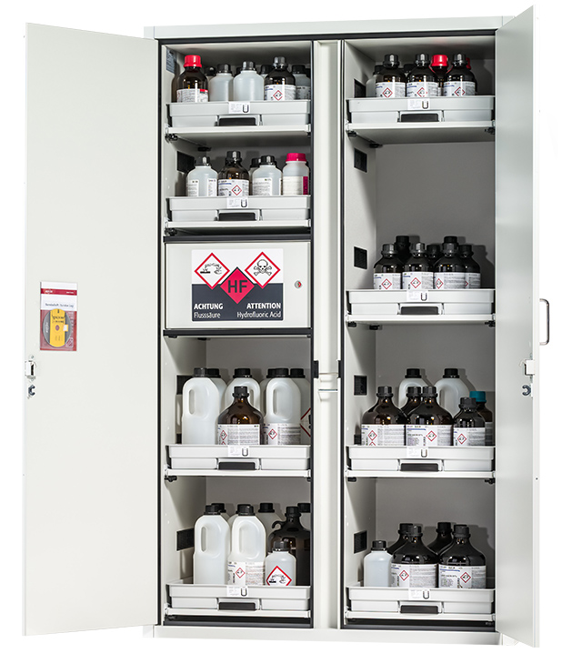 Lichtgrau (RAL 7035), Inneneinrichtung mit 8 x Tablarauszug (Werkstoffplatte/PP melaminharzbeschichtet), 1 x Einbaufach Flusssäure (Werkstoffplatte/PE melaminharzbeschichtet)