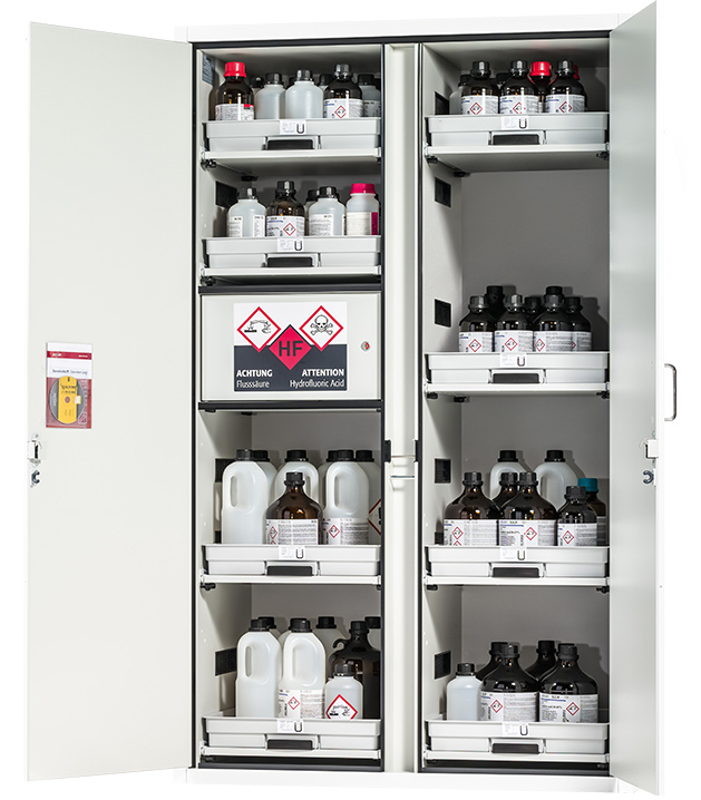 Laborweiß (ähnl. RAL 9016), Inneneinrichtung mit 8 x Tablarauszug (Werkstoffplatte/PP melaminharzbeschichtet), 1 x Einbaufach Flusssäure (Werkstoffplatte/PE melaminharzbeschichtet)