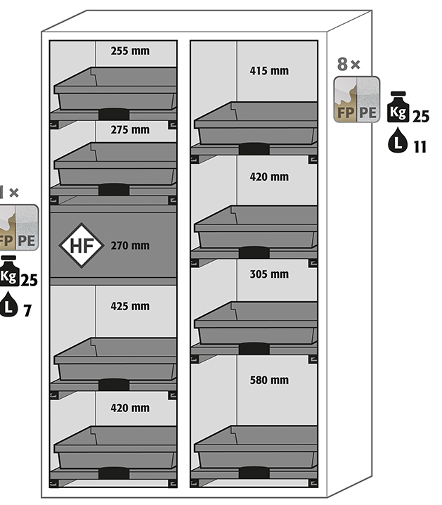 - Zwei in einem: zwei Abteile erlauben die getrennte Lagerung von Säuren und Laugen in einem Schrank
