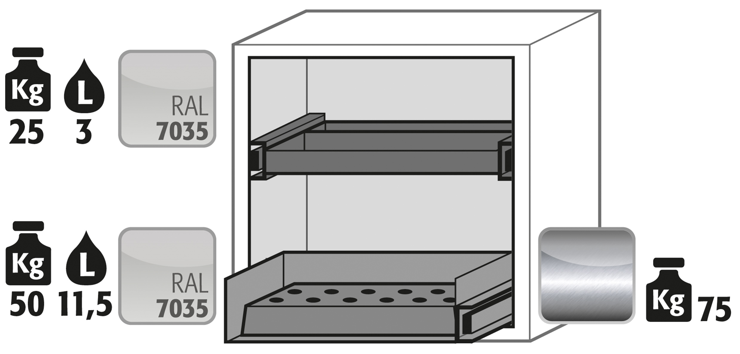 Lichtgrau (RAL 7035), Inneneinrichtung mit 1 x Schubladenwanne (Stahlblech pulverbeschichtet), 1 x Lochblecheinsatz (Edelstahl 1.4016), 1 x 2. Auszugsebene (Stahlblech pulverbeschichtet)