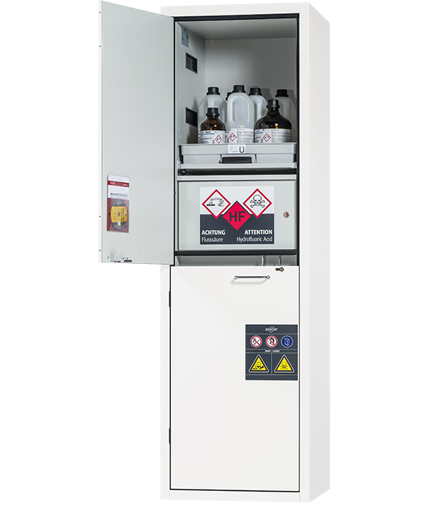 Laborweiß (ähnl. RAL 9016), Inneneinrichtung mit 3 x Tablarauszug (Werkstoffplatte/PP melaminharzbeschichtet), 1 x Einbaufach Flusssäure (Werkstoffplatte/PE melaminharzbeschichtet)
