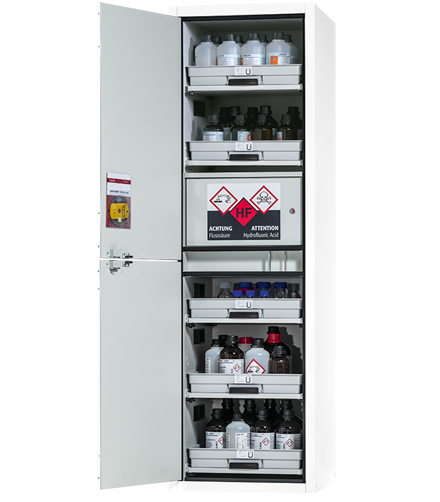 Laborweiß (ähnl. RAL 9016), Inneneinrichtung mit 5 x Tablarauszug (Werkstoffplatte/PP melaminharzbeschichtet), 1 x Einbaufach Flusssäure (Werkstoffplatte/PE melaminharzbeschichtet)