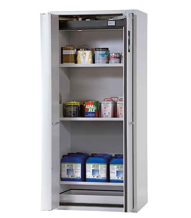 Lichtgrau (RAL 7035), Inneneinrichtung mit 3 x Fachboden, 1 x Bodenauffangwanne (Stahlblech pulverbeschichtet)