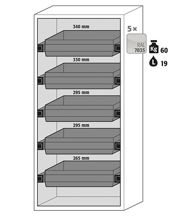 Lichtgrau (RAL 7035), Inneneinrichtung mit 5 x Auszugswanne (Stahlblech pulverbeschichtet)
