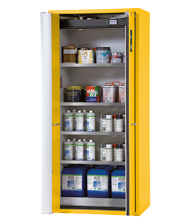 Sicherheitsgelb (RAL 1004), Inneneinrichtung mit 4 x Fachboden (Edelstahl 1.4301), 1 x Lochblecheinsatz (Edelstahl 1.4016), 1 x Bodenauffangwanne (Edelstahl 1.4301)
