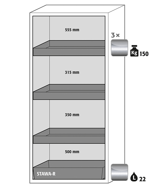 Sicherheitsgelb (RAL 1004), Inneneinrichtung mit 3 x Wannenboden, 1 x Bodenauffangwanne (Edelstahl 1.4301)