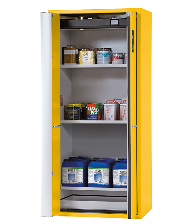 Sicherheitsgelb (RAL 1004), Inneneinrichtung mit 3 x Fachboden, 1 x Bodenauffangwanne (Stahlblech pulverbeschichtet)