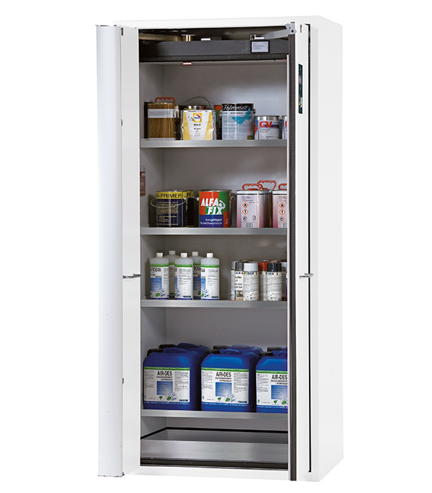 Laborweiß (ähnl. RAL 9016), Inneneinrichtung mit 4 x Fachboden, 1 x Bodenauffangwanne (Edelstahl 1.4301)