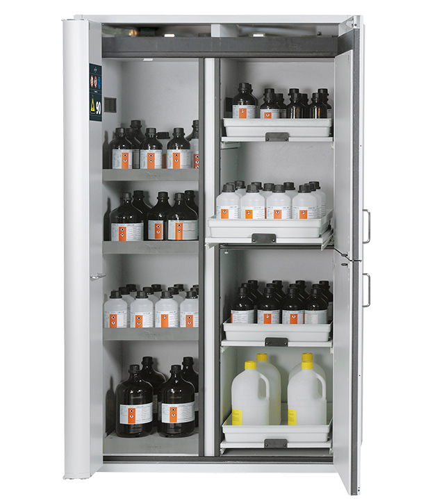 - Zwei in einem: zwei Abteile (vertikale Teilung) erlauben die Lagerung entzündbarer und aggressiver Gefahrstoffe in einem Schrank