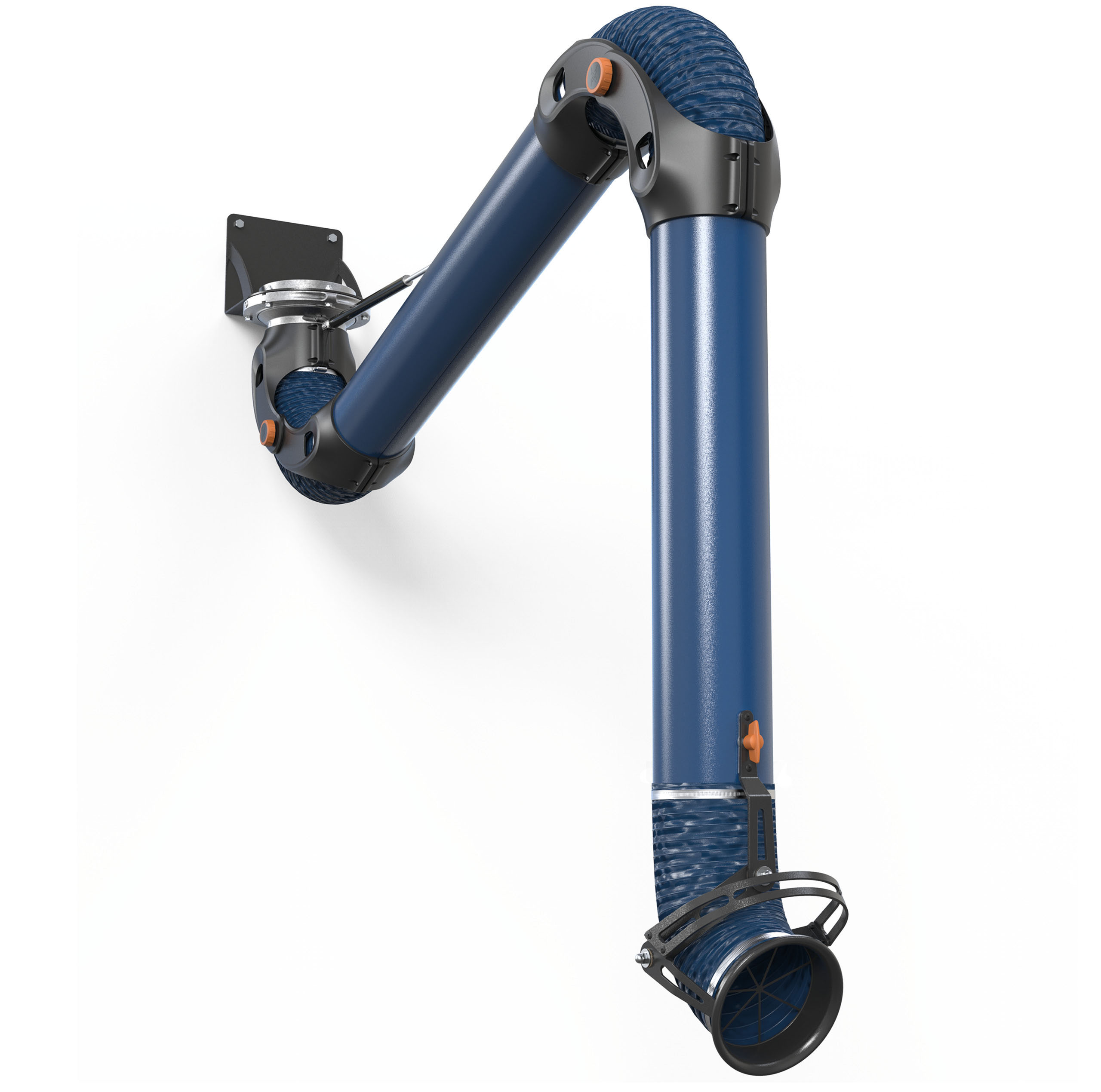 Extrem leicht zu manövrieren und selbst bei komplett ausgefahrenem Arm sehr positionsstabil. Das Eigengewicht des Absaugarms wird durch eine außen montierte Gasdruckfeder ausgeglichen. Die Absaughaube lässt sich in alle Richtungen um 90° anwinkeln, und die Wandhalterung bietet außerdem eine 360°-Drehgelenkfunktion. Der Absauger wird serienmäßig mit manueller Luftklappe und einem Schlauch aus feuerhemmendem PVC geliefert.