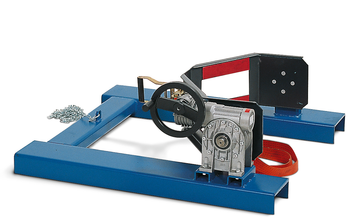 - Im Frontbereich eingebaute, drehbar gelagerte Prismenbacke, mittels manuellem Zurrgerät kann jedes beliebige Fass eingespannt werden