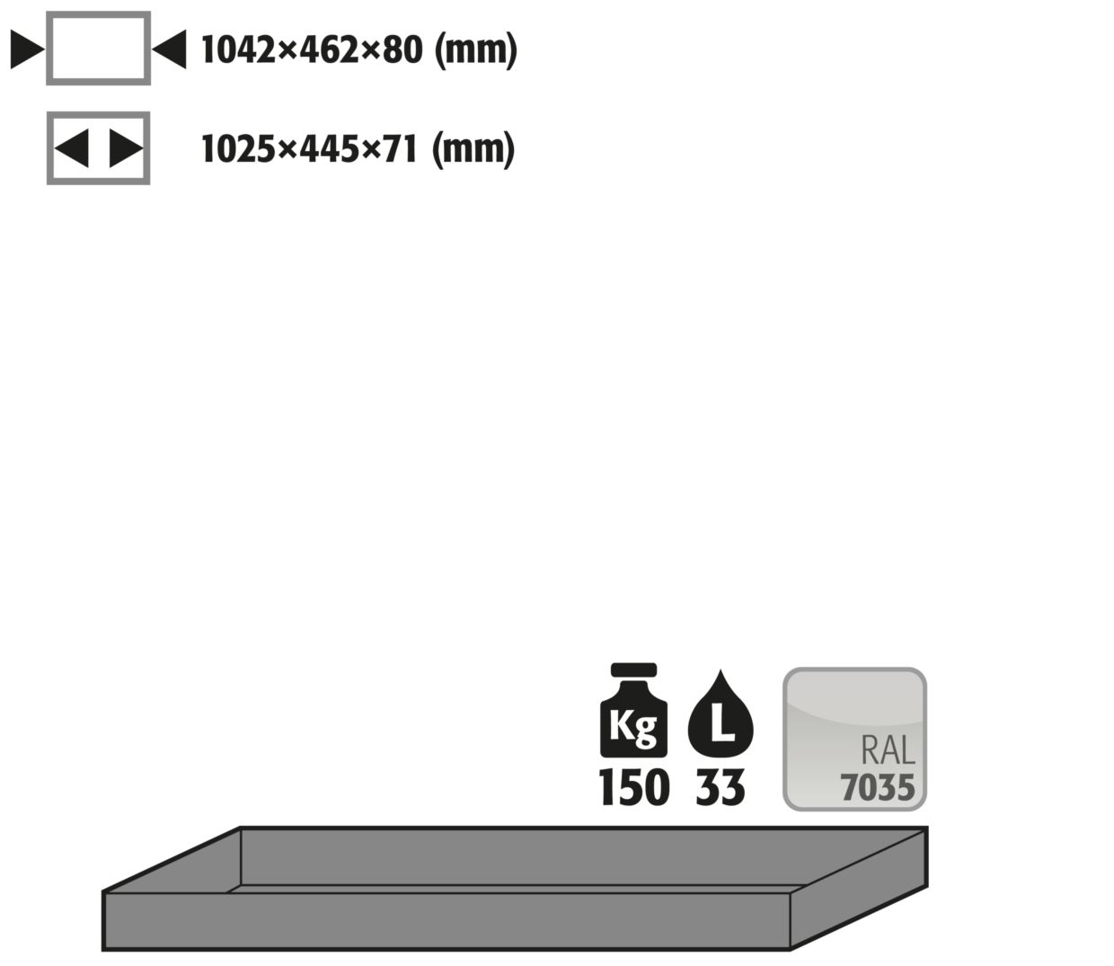 - Dimensions interior: W x D x H (mm) 1022 x 442 x 80