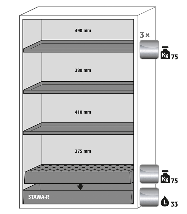 laboratory white (sim. RAL 9016), interior equipment with 3 x shelf (stainless steel 1.4301), 1 x perforated insert, 1 x bottom collecting sump (stainless steel 1.4016)