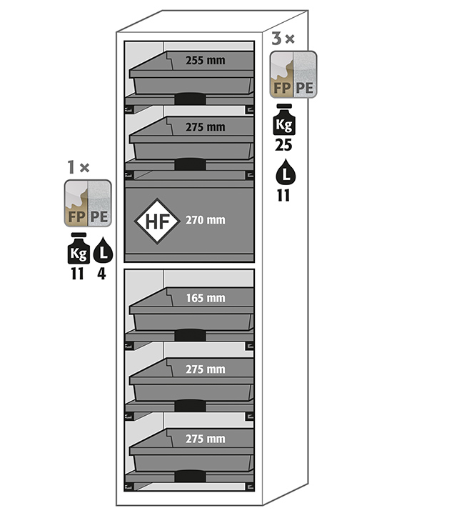 light grey (RAL 7035), interior equipment with 5 x pull-out shelf (panel/PP melamine resin-coated), 1 x storage box for hydrofluoric acid (panel / PE melamine resin-coated)