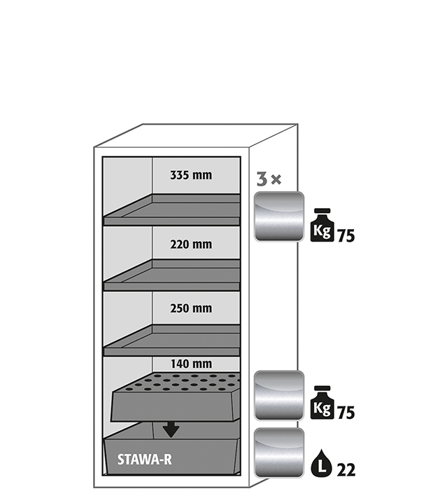 light grey (RAL 7035), interior equipment with 3 x shelf (stainless steel 1.4301), 1 x perforated insert, 1 x bottom collecting sump (stainless steel 1.4016)