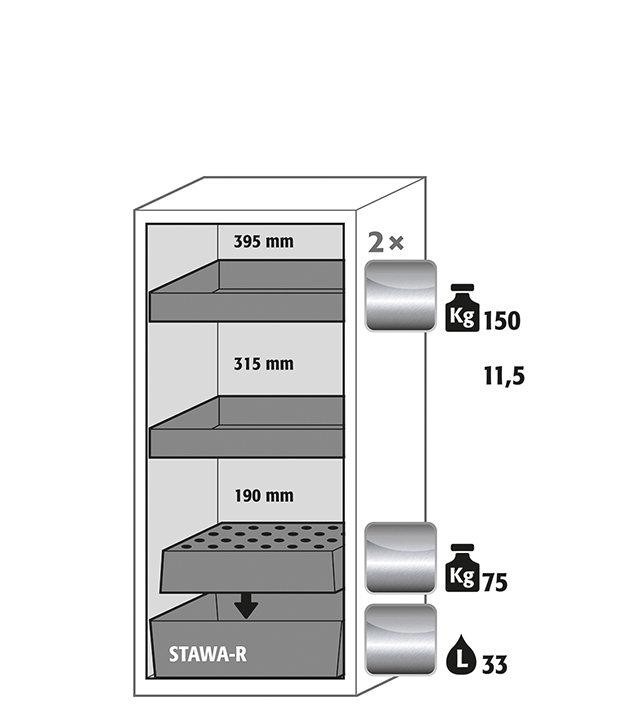 light grey (RAL 7035), interior equipment with 2 x tray shelf (stainless steel 1.4301), 1 x perforated insert (stainless steel 1.4016), 1 x bottom collecting sump (stainless steel 1.4301)