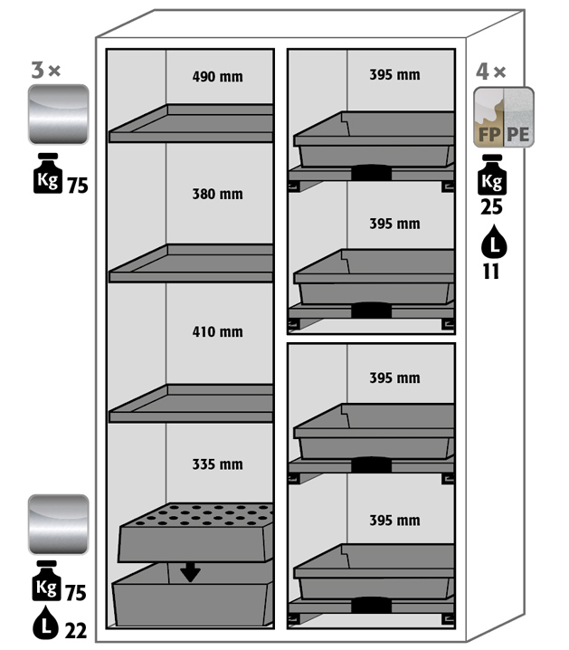 light grey (RAL 7035), interior equipment with 3 x shelf (stainless steel 1.4301), 1 x perforated insert, 1 x bottom collecting sump (stainless steel 1.4016), 4 x pull-out shelf (panel/PP melamine resin-coated)