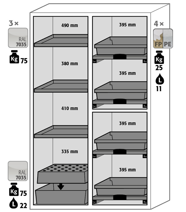 light grey (RAL 7035), interior equipment with 3 x shelf, 1 x perforated insert, 1 x bottom collecting sump (sheet steel powder-coated), 4 x pull-out shelf (panel/PP melamine resin-coated)