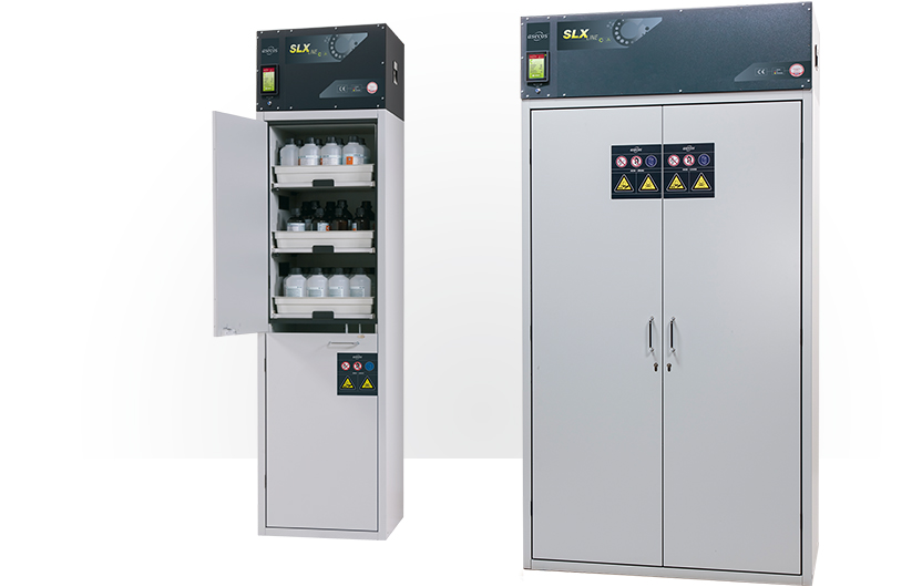 Flexible storage of the most diverse aggressive acids, alkalis and further chemicals in one cabinet
