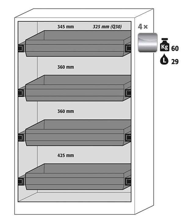 Body colour anthracite grey, with wing doors in Reseda green (RAL 6011), interior equipment with 4 x drawer (stainless steel 1.4301)