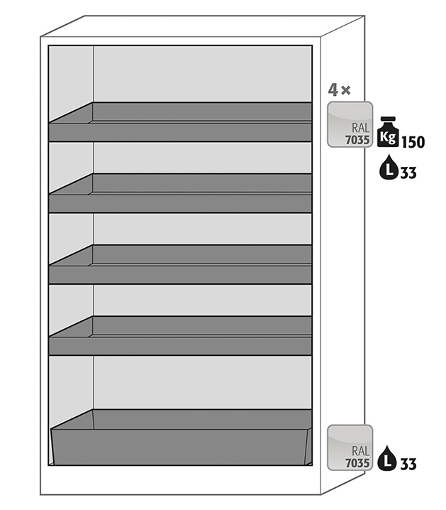 Body colour anthracite grey, with wing doors in light grey (RAL 7035), interior equipment with 4 x tray shelf, 1 x bottom collecting sump (sheet steel powder-coated)