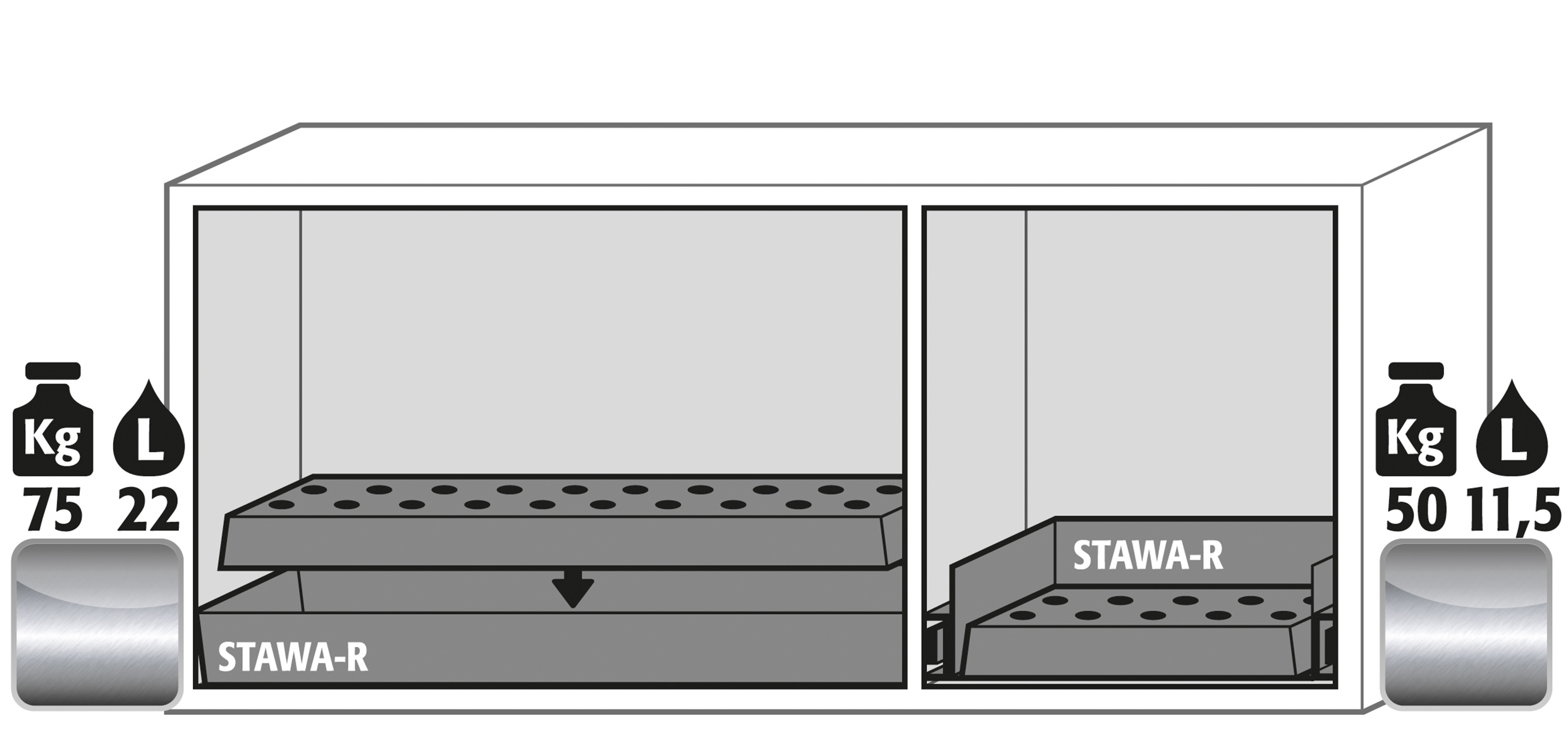 laboratory white (sim. RAL 9016), interior equipment with 1 x perforated insert (stainless steel 1.4016), 1 x bottom collecting sump, 1 x drawer (stainless steel 1.4301), 1 x perforated insert (stainless steel 1.4016)