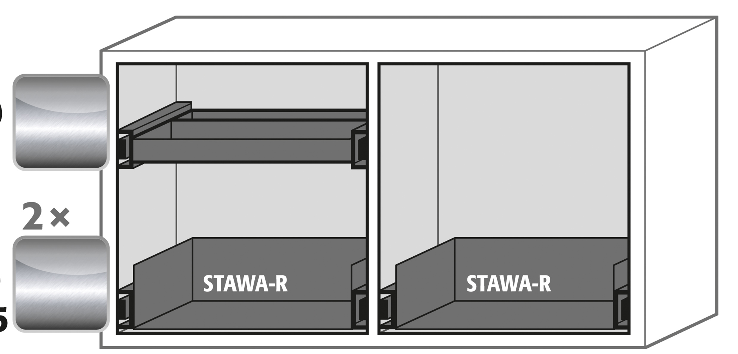 blanco laboratorio (sim. RAL 9016), equipamiento interior con 2 x cajón, 1 x cajón 2º nivel (acero inox. 1.4301)