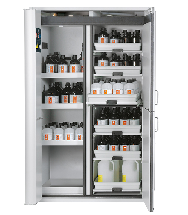 - Dos en uno: Dos compartimentos (división vertical) permiten el almacenamiento de sustancias peligrosas inflamables y corrosivas en un armario