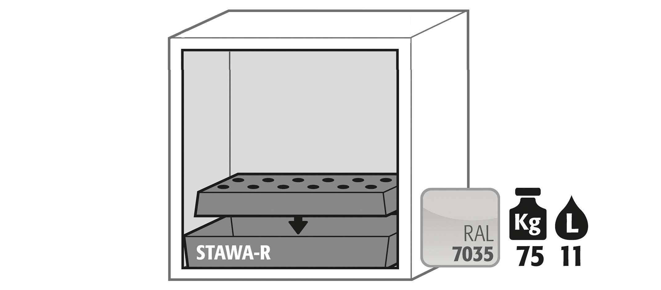 blanco laboratorio (sim. RAL 9016), equipamiento interior con 1 x bandeja perforada, 1 x cubeto de retención (plancha de acero recubrimiento plástico)