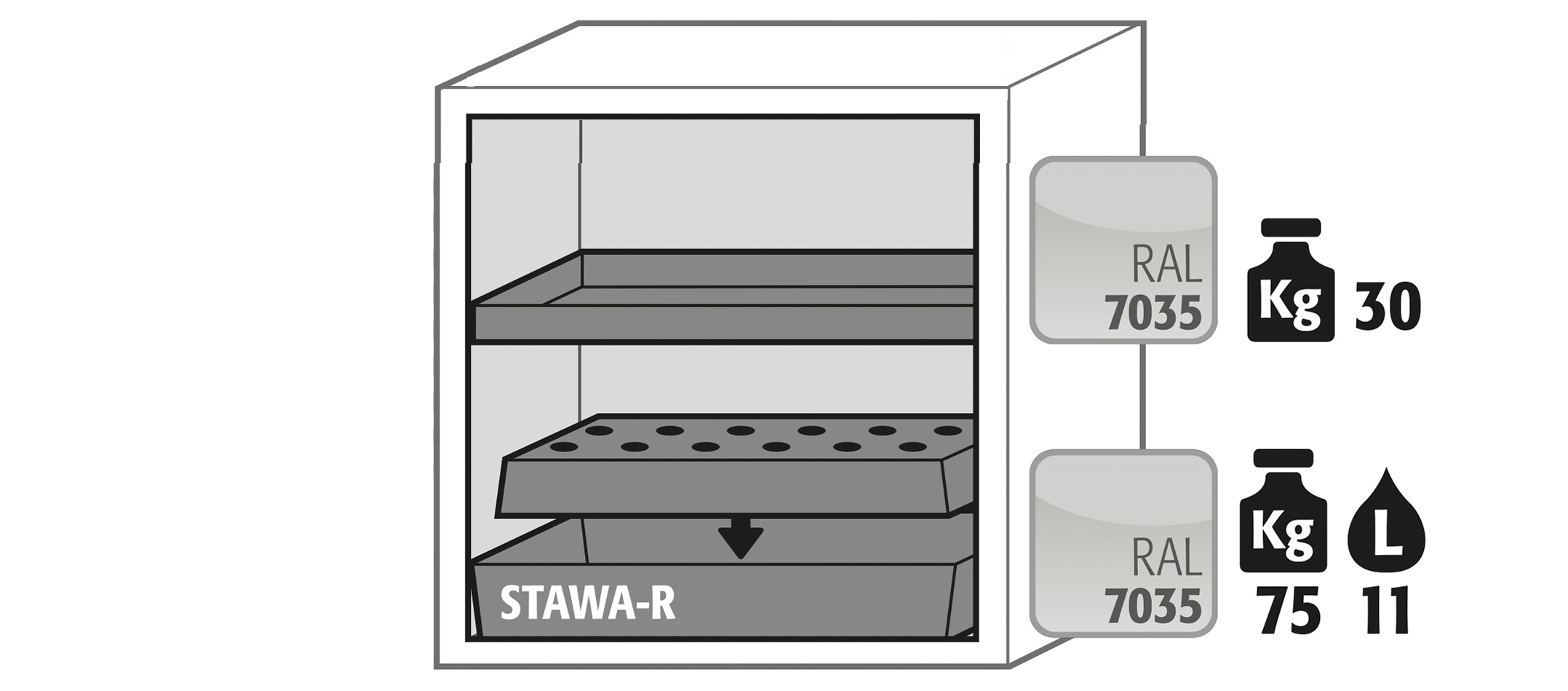 blanco laboratorio (sim. RAL 9016), equipamiento interior con 1 x bandeja, 1 x bandeja perforada, 1 x cubeto de retención (plancha de acero recubrimiento plástico)