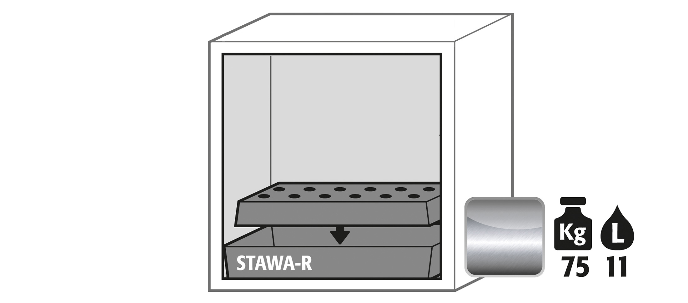 blanco laboratorio (sim. RAL 9016), equipamiento interior con 1 x bandeja perforada (acero inoxidable 1.4016), 1 x cubeto de retención (acero inox. 1.4301)