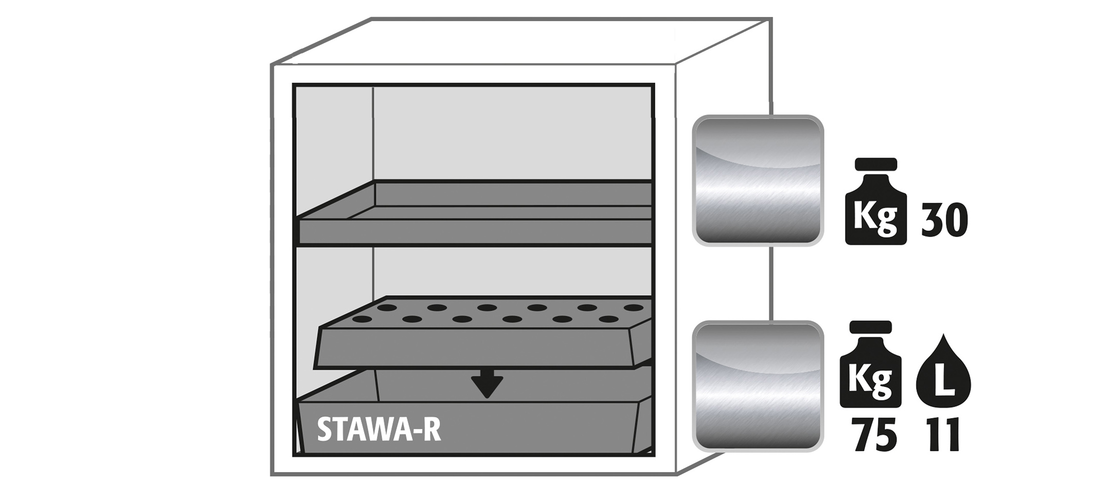 blanco laboratorio (sim. RAL 9016), equipamiento interior con 1 x bandeja (acero inox. 1.4301), 1 x bandeja perforada (acero inoxidable 1.4016), 1 x cubeto de retención (acero inox. 1.4301)