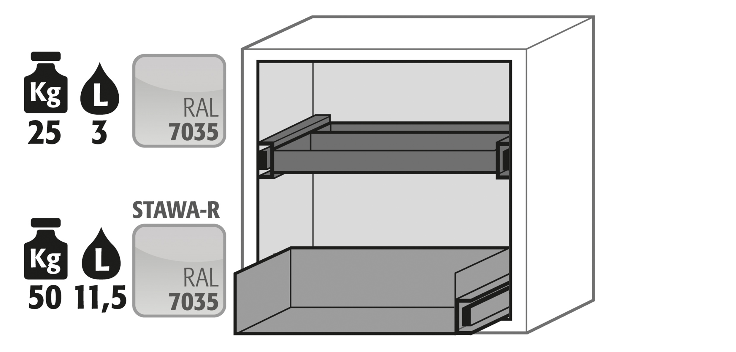 gris claro (RAL 7035), equipamiento interior con 1 x cajón, 1 x cajón 2º nivel (plancha de acero recubrimiento plástico)
