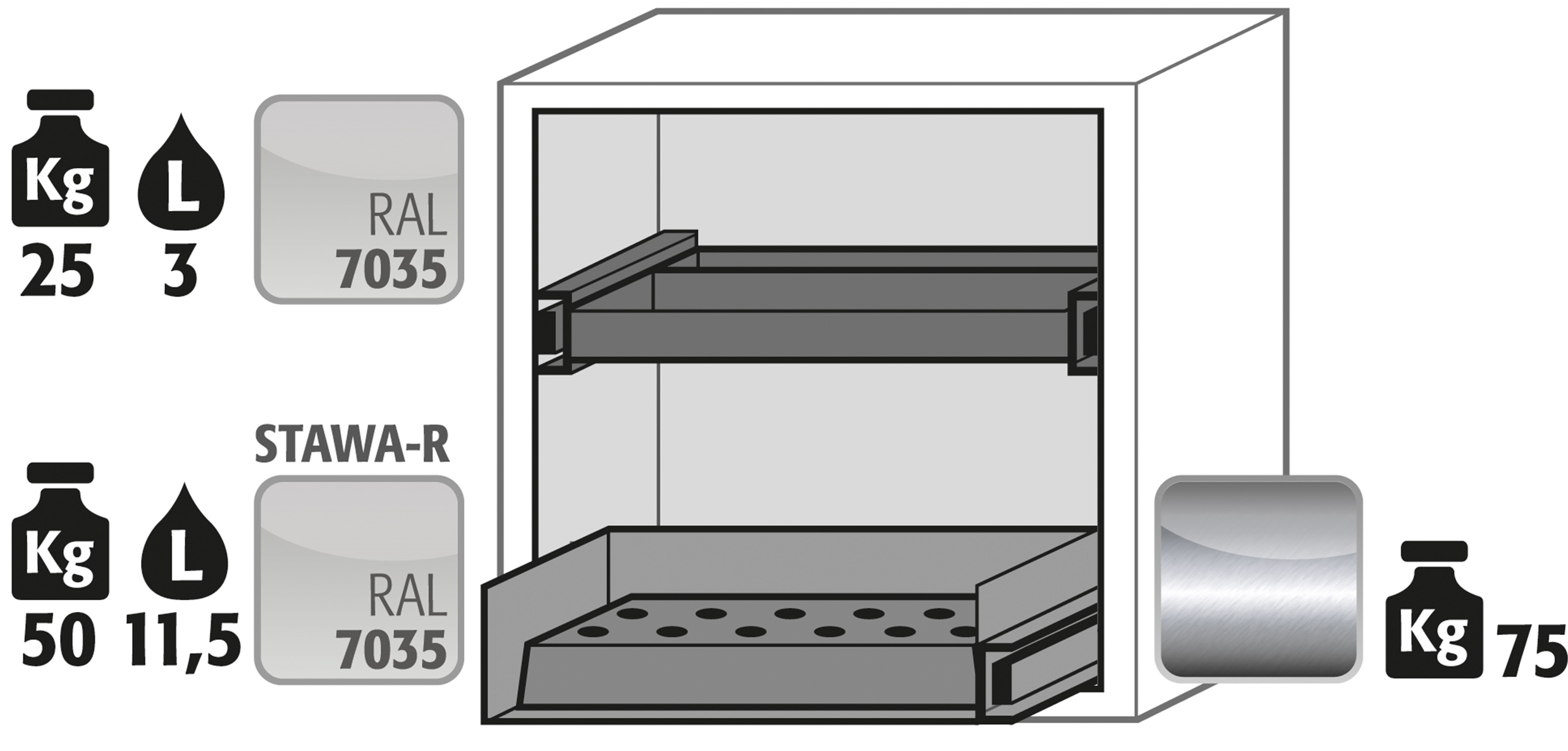 blanco laboratorio (sim. RAL 9016), equipamiento interior con 1 x cajón (plancha de acero recubrimiento plástico), 1 x bandeja perforada (acero inoxidable 1.4016), 1 x cajón 2º nivel (plancha de acero recubrimiento plástico)