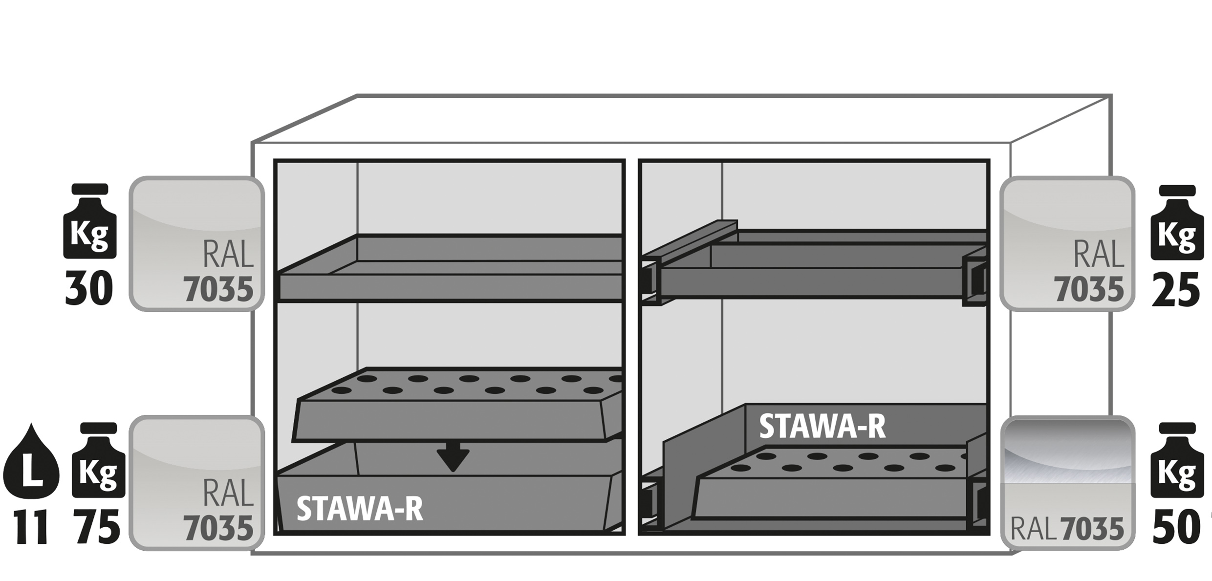 blanco laboratorio (sim. RAL 9016), equipamiento interior con 1 x bandeja, 1 x bandeja perforada, 1 x cubeto de retención, 1 x cajón (plancha de acero recubrimiento plástico), 1 x bandeja perforada (acero inox. 1.4016), 1 x cajón 2º nivel (plancha de acero recubrimiento plástico)