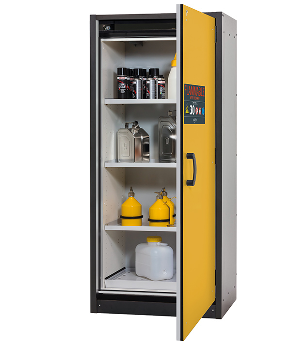 color del cuerpo gris antracita, con puerta batiente en amarillo seguridad (RAL 1004), equipamiento interior con 3 x bandeja, 1 x bandeja perforada, 1 x cubeto de retención (plancha de acero recubrimiento plástico)