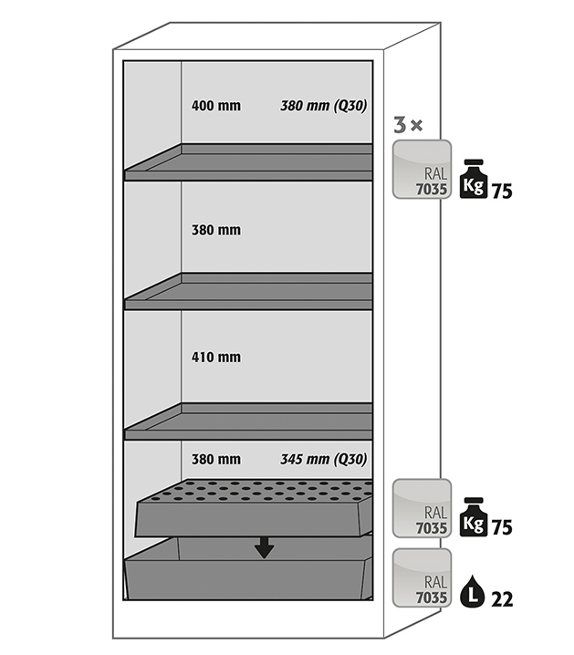 color del cuerpo gris antracita, con puerta batiente en gris claro (RAL 7035), equipamiento interior con 3 x bandeja, 1 x bandeja perforada, 1 x cubeto de retención (plancha de acero recubrimiento plástico)