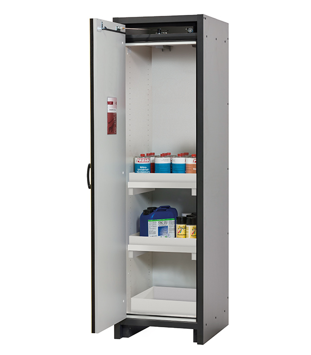 color del cuerpo gris antracita, con puerta batiente en amarillo seguridad (RAL 1004), equipamiento interior con 2 x bandeja tipo cubeta, 1 x cubeto de retención (PP)