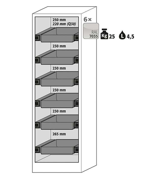 color del cuerpo gris antracita, con puerta batiente en gris claro (RAL 7035), equipamiento interior con 6 x cajón extraíble (plancha de acero recubrimiento plástico)