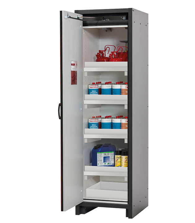 color del cuerpo gris antracita, con puerta batiente en rojo tráfico (RAL 3020), equipamiento interior con 4 x bandeja tipo cubeta, 1 x cubeto de retención (PP)