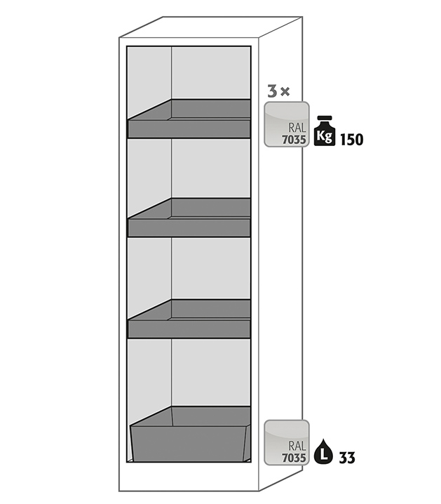 color del cuerpo gris antracita, con puerta batiente en verde reseda (RAL 6011), equipamiento interior con 3 x bandeja tipo cubeta, 1 x cubeto de retención (plancha de acero recubrimiento plástico)
