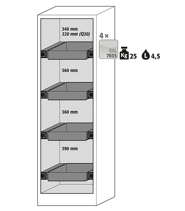 color del cuerpo gris antracita, con puerta batiente en verde reseda (RAL 6011), equipamiento interior con 4 x cajón extraíble (plancha de acero recubrimiento plástico)
